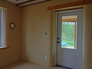 | Oak threshold at the entry door. You can see that the final layer of adobe mix will bring the floor level up about 3/4" to be even with the threshold |